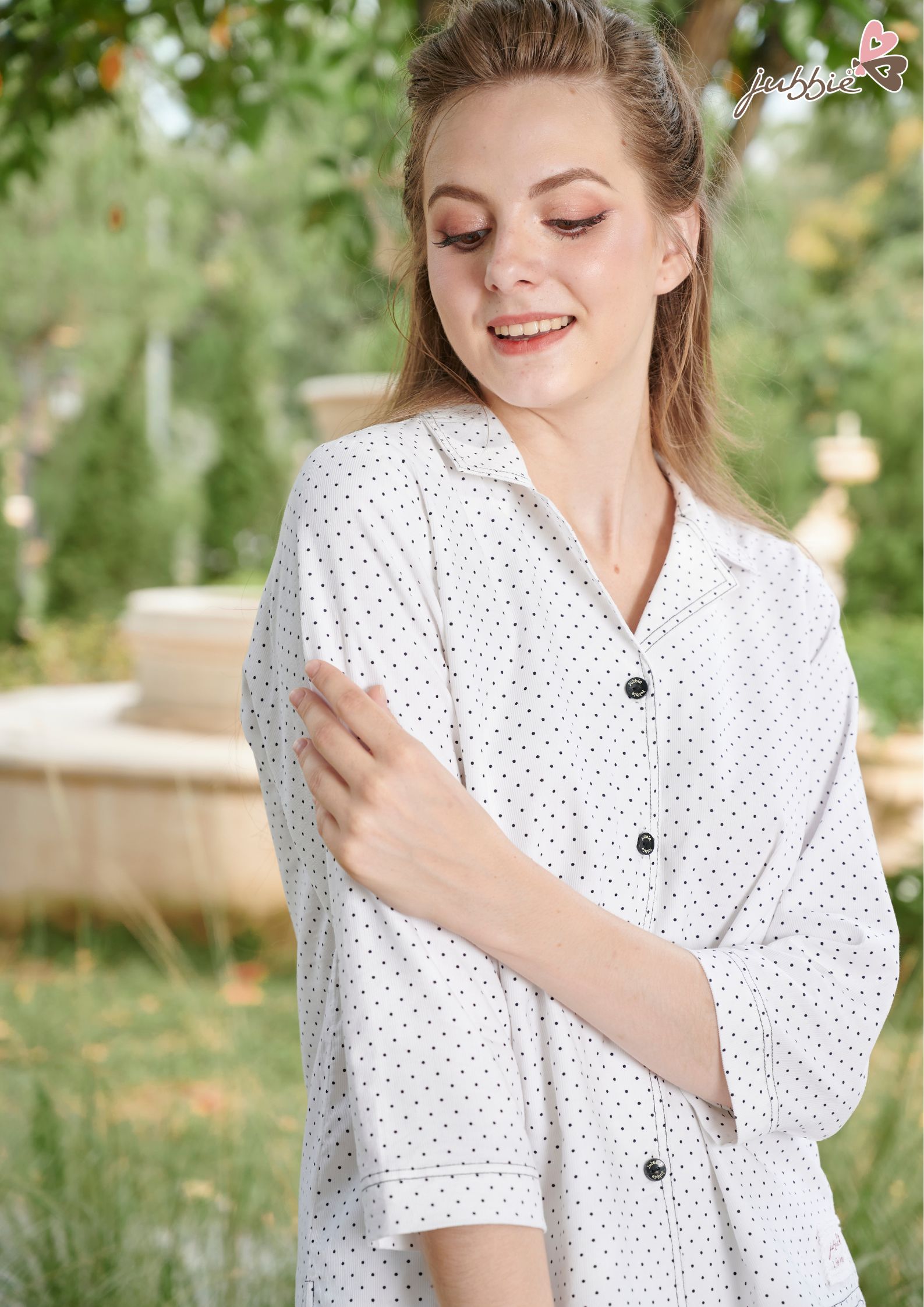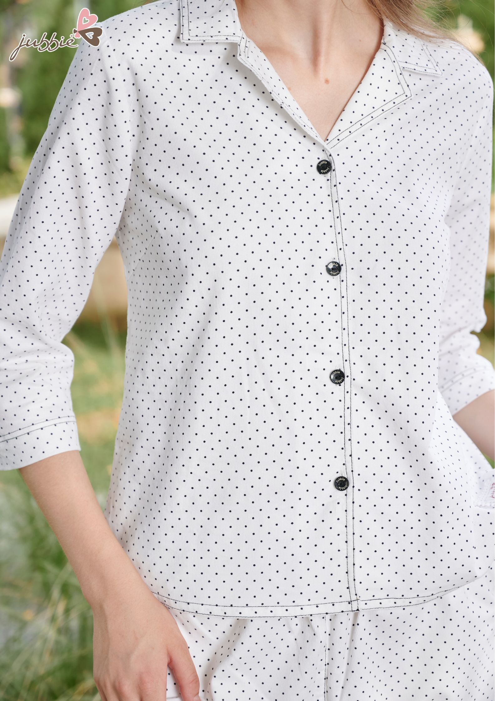 Gam màu sáng phối chấm bi mang lại sự dịu dàng, bình yên rất phù hợp để diện vào mùa Thu Đông . Thiết kế cổ V Danton kết hợp cùng bản phối tay lửng không chỉ tôn lên sự kín đáo để nàng diện ở nhà hay tiếp khách mà còn rất thoải mái khi mặc vào những ngày se lạnh.
