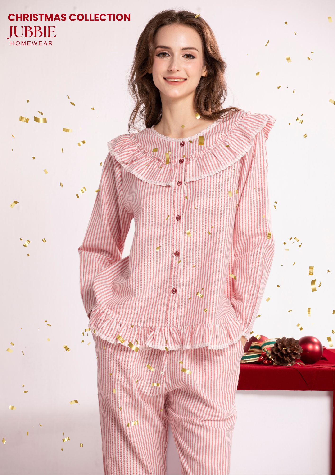 Nổi bật với thiết kế họa tiết kẻ sọc đầy thanh lịch và nữ tính, JUBBIE mang đến 2 set bộ dài cực kỳ trendy để các chị em diện đổi mới cho mùa Giáng Sinh năm nay. Chất vải nỉ mỏng khá mềm mại, mặc cực kỳ êm ái trên da. Vừa thích hợp diện đẹp ở nhà, tiếp khách hay cho Nàng giấc ngủ ngon sâu giấc.