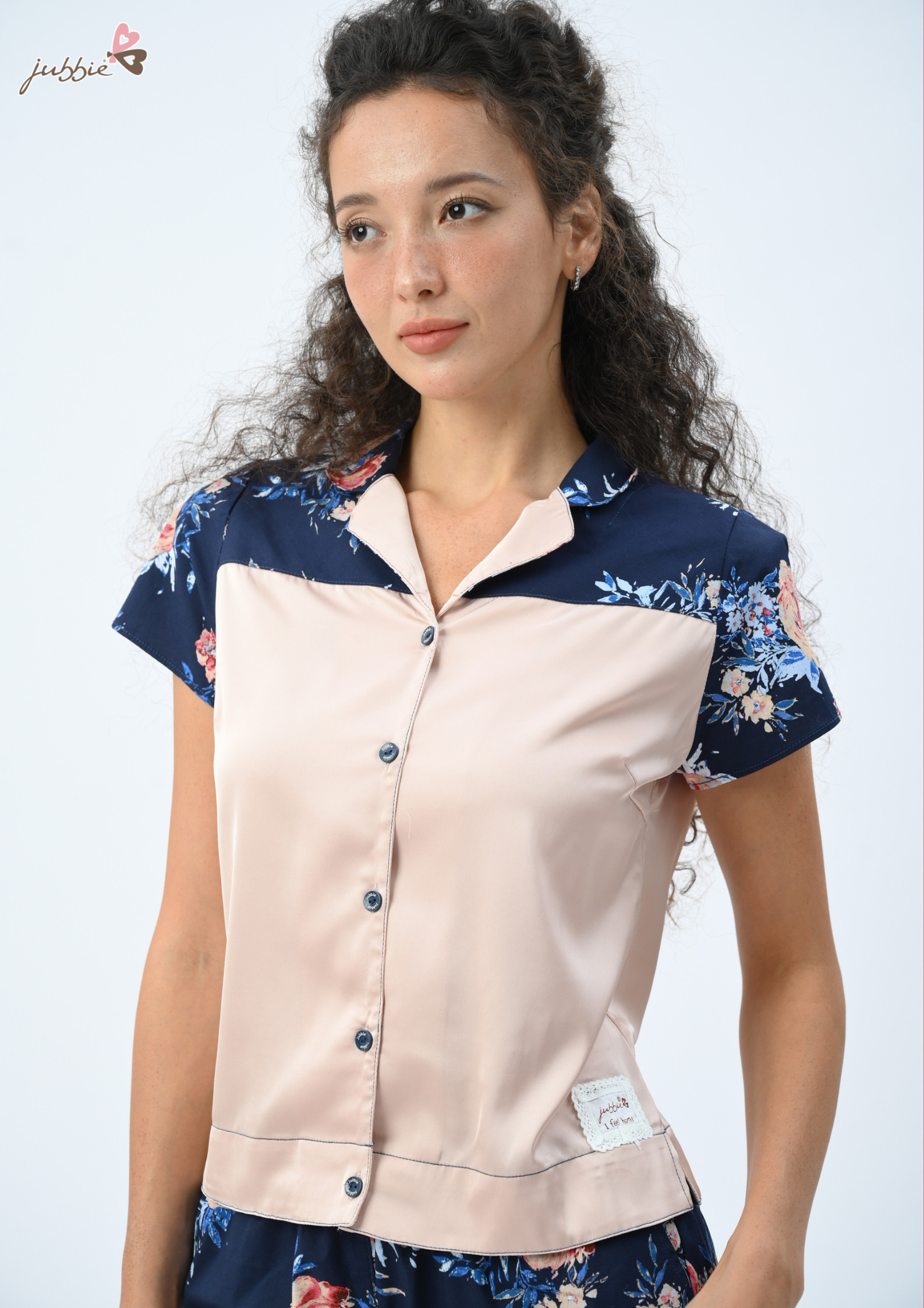 Chi tiết áo cổ bẻ chữ V thanh lịch, tay ngắn với nền vải lụa mềm mại.