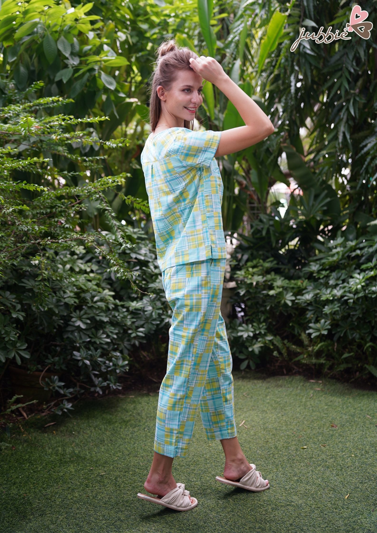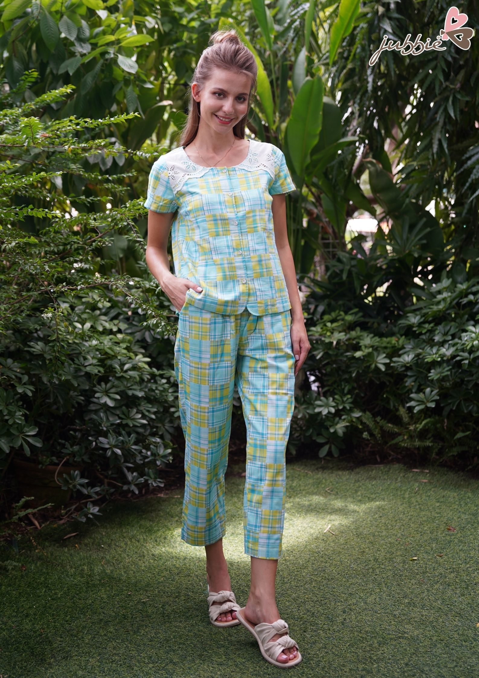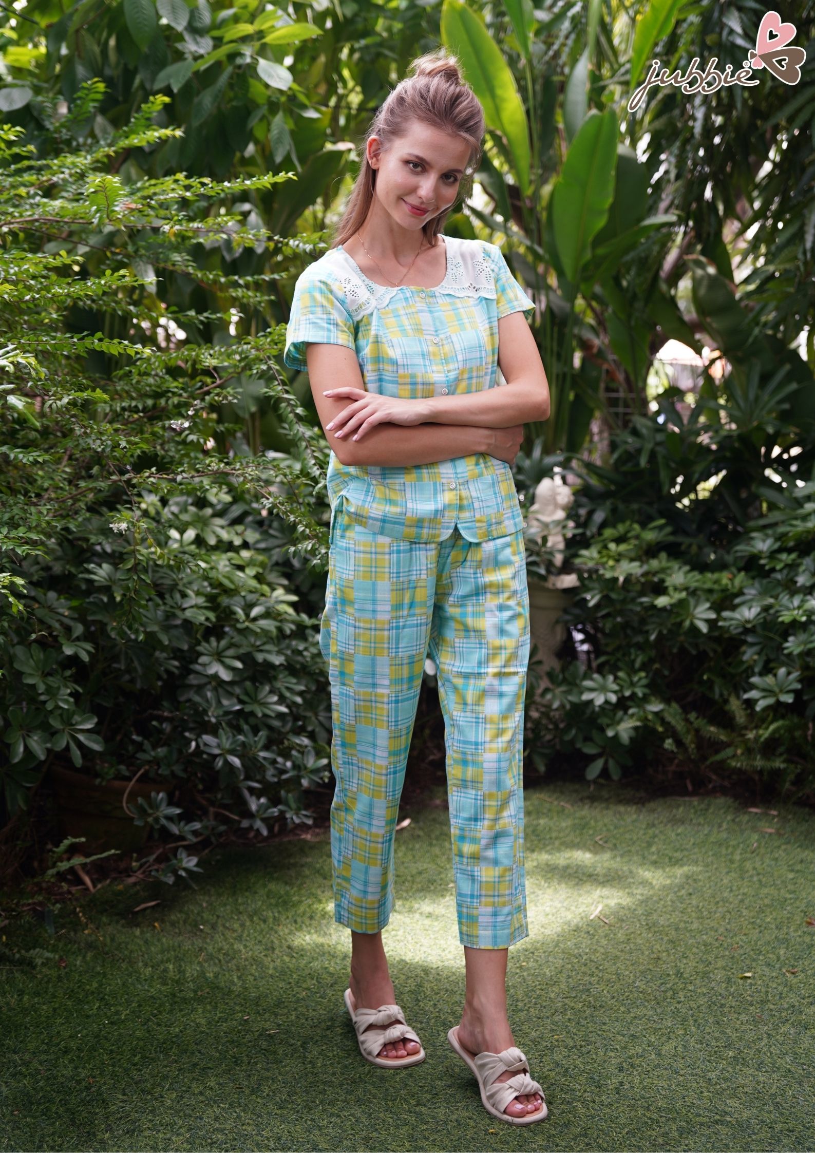 Nền vài in ô vuông caro xanh độc đáo, tone màu xanh nổi bật