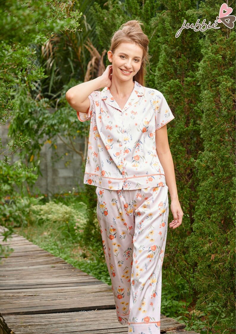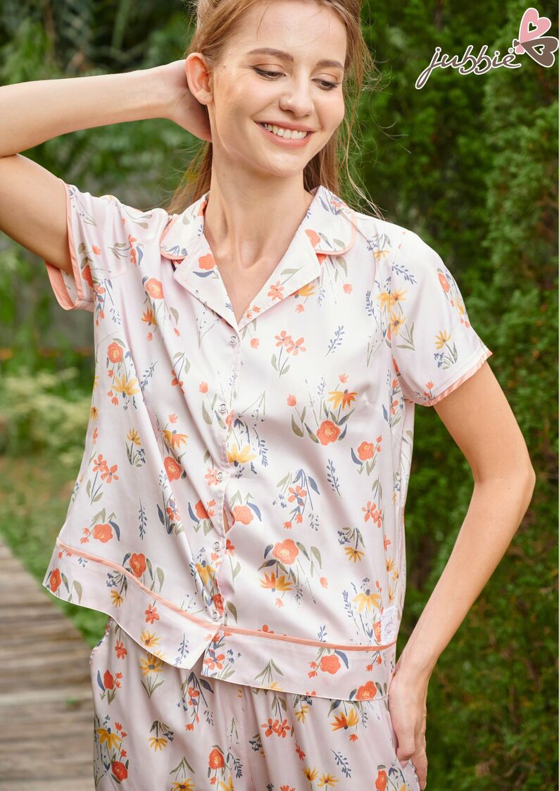 Họa tiết bông hồng cam nổi bật, tinh tế được phối hoàn hảo trên nền vải gam màu hồng nhạt