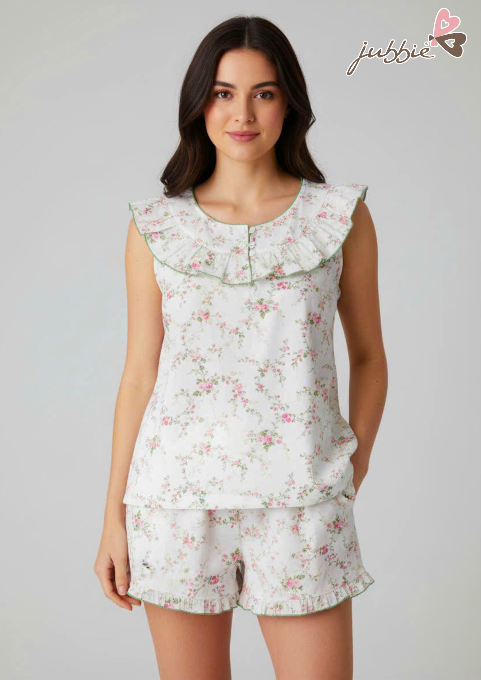 Thiết kế cổ tròn phối may viền bèo khá dễ thương nữ tính