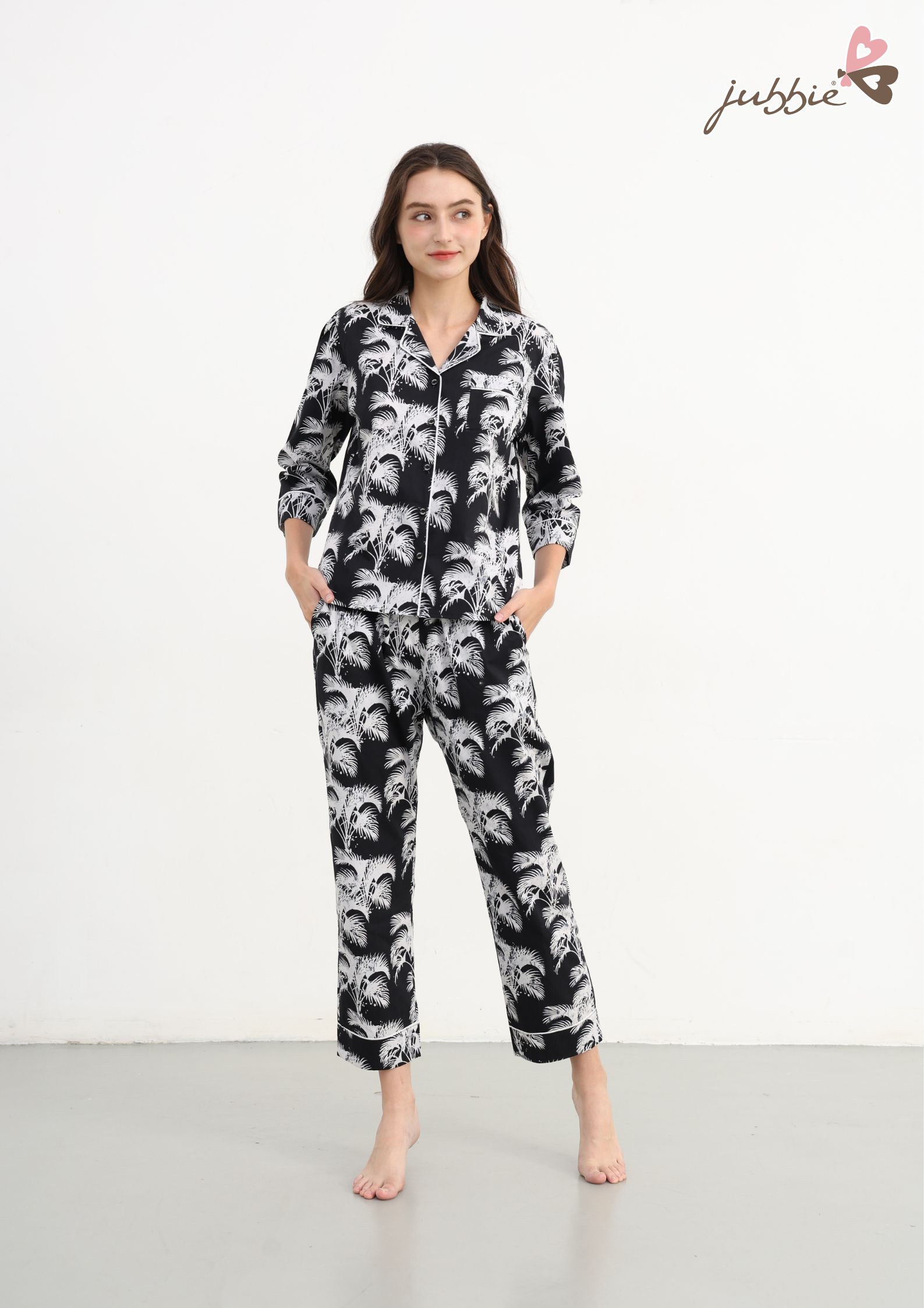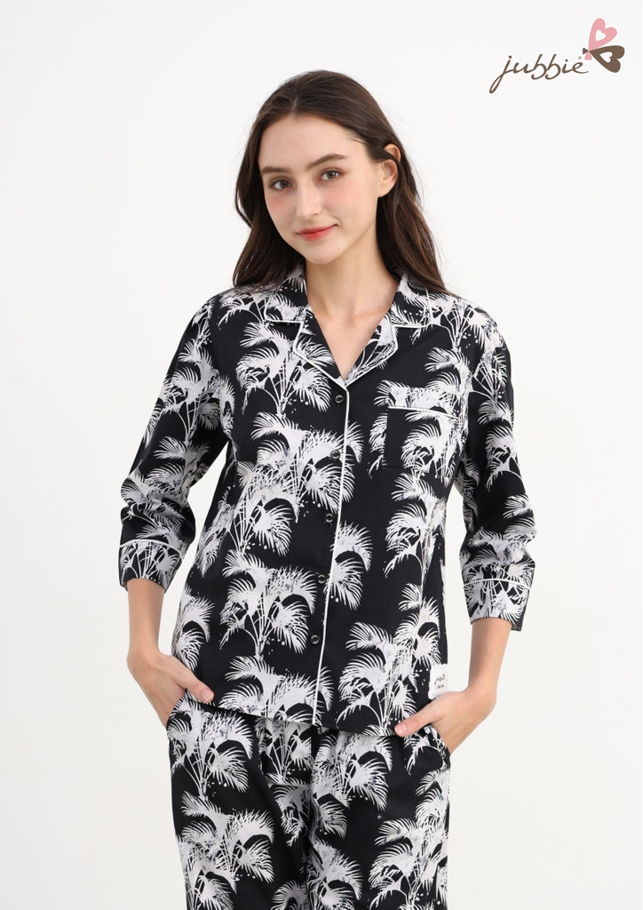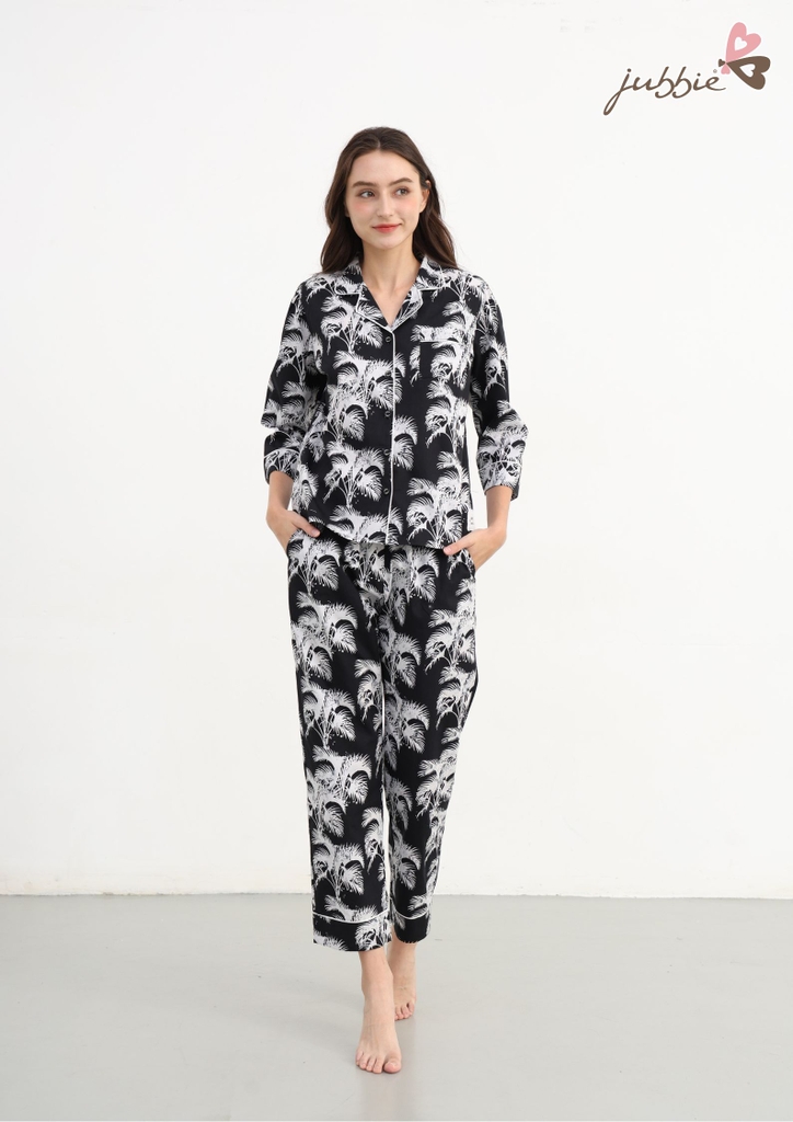 Set bộ dài với họa tiết cọ lá độc đáo, mang hơi thở thiên nhiên hiện đại, tạo điểm nhấn tinh tế nhưng vẫn đầy cá tính.