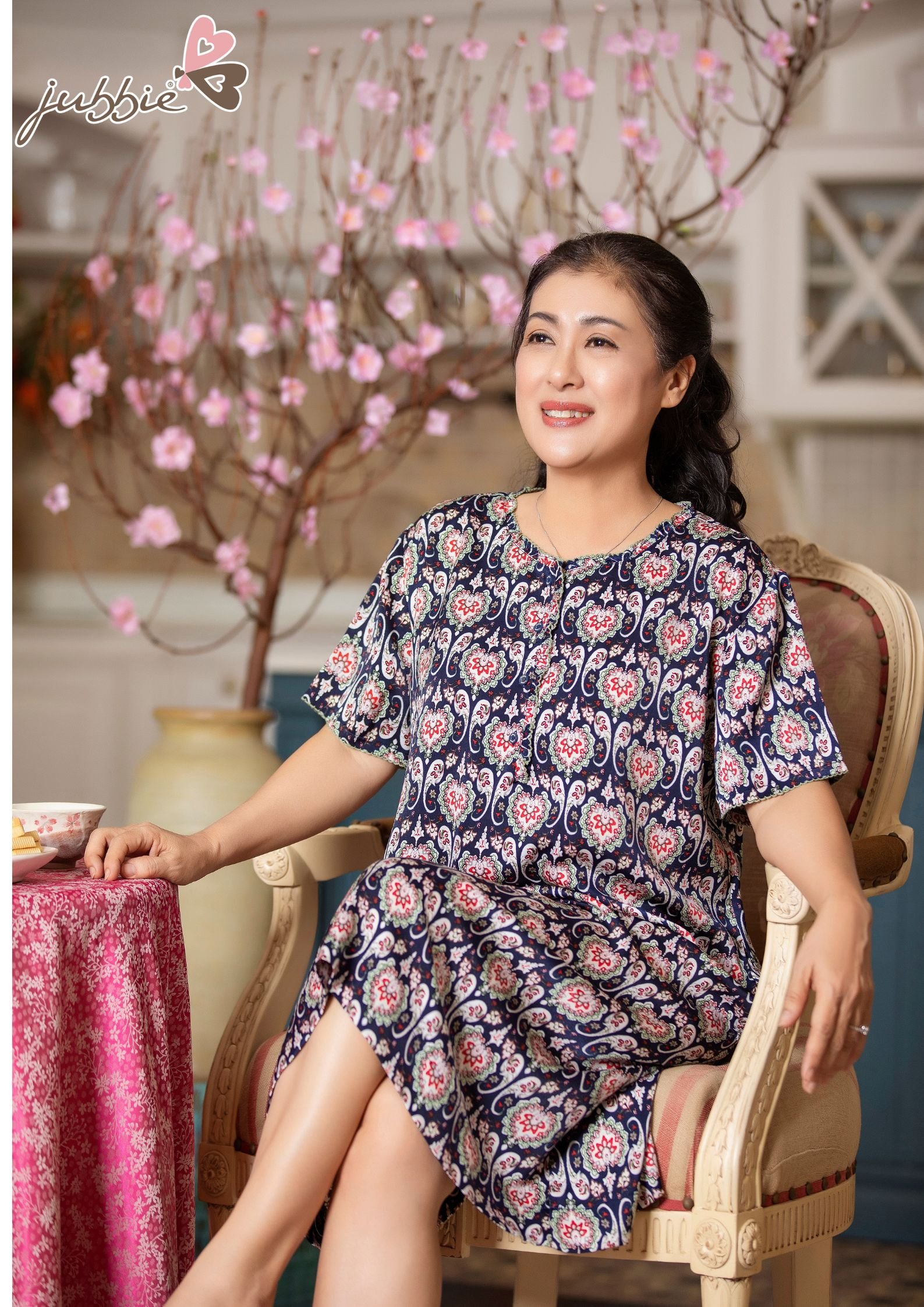 Thiết kế lụa óng mịn suông dài khoác lên mình vẻ hiện đại và phóng khoáng, che khuyết điểm tốt. Từ những cách điệu phần cổ áo làm nên điểm nhấn cho cả bộ trang phục.
